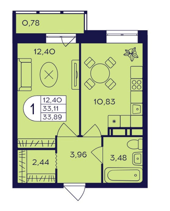 Планировка однокомнатной квартиры 33,89