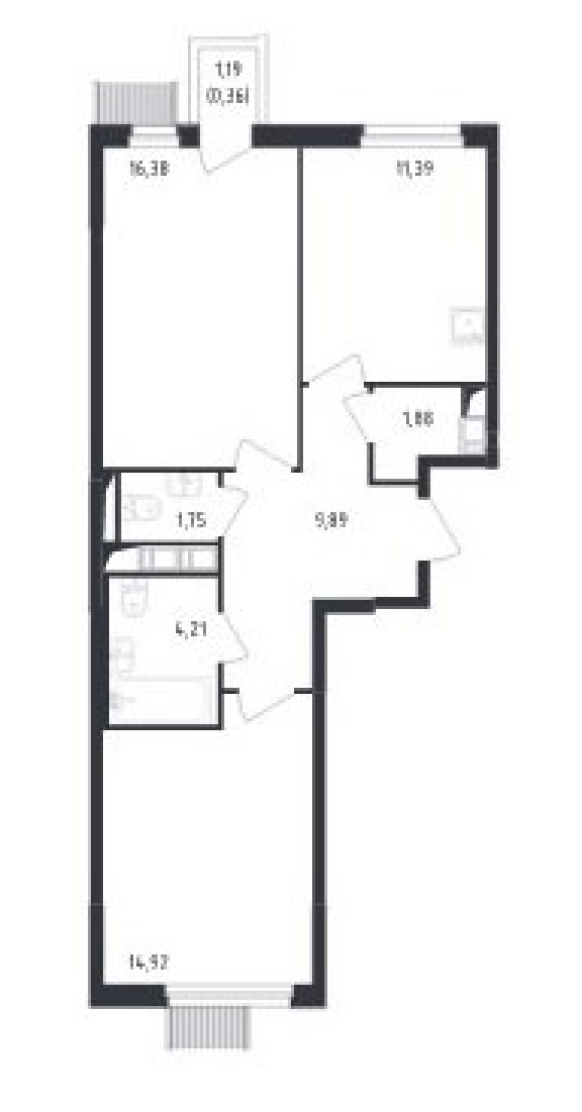 В двухкомнатных квартирах входная зона занимает от 3,35 до 9,89 кв.м., санузлы либо совмещенные площадью от 3,42 до 3,88 кв.м., либо раздельные площадью от 1,75 до 4,21 кв.м. В квартирах формата евро универсальные помещения (спальня-кухня-гостиная) составляют от 14,43 до 21,09 кв.м., в классике кухня 11,39, спальни от 16,32 до 16,38 кв.м. В классике встречается балкон 1,19 кв.м. и кладовая 1,66 кв.м.