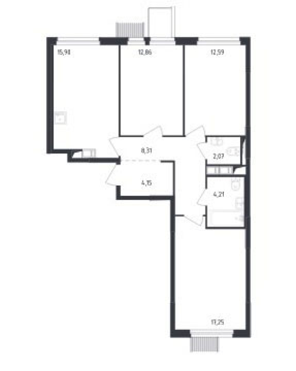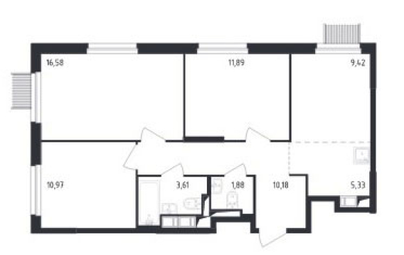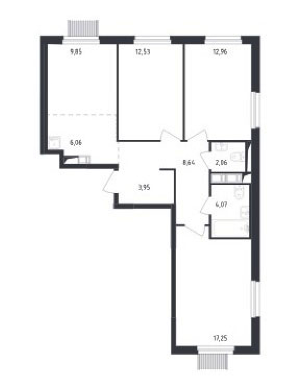 Четырехкомнатные квартиры евро формата располагают входными зонами от 10,18 до 12,4 (с учетом внутреннего коридора). Санузлы раздельные, площадью от 1,88 до 4,26 кв.м., иногда два полноценных. Кухни (они же комнаты) площадью от 14,75 до 17,25 кв.м. Спальни от 10,97 до 17,25 кв.м.