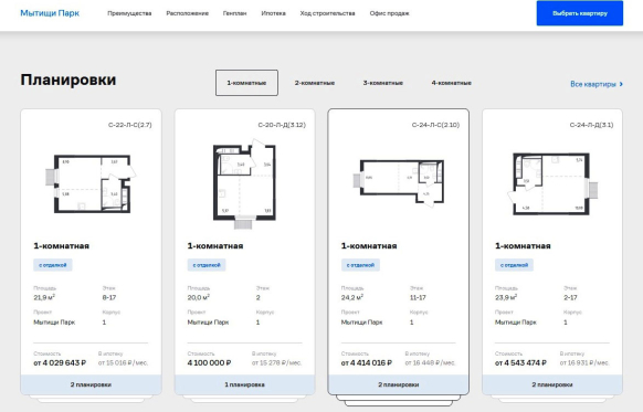 Подробно описана отделка квартир и даже встроен механизм виртуальной прогулки по квартире в формате 3-D. Для выбора планировки предусмотрен удобный поиск по параметрам, цены на сайте актуальные. Есть необходимые пояснения для ипотеки.