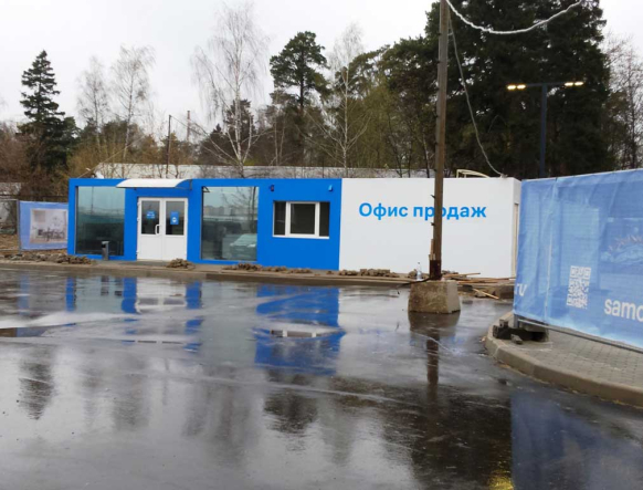 Офис продаж расположен на «нейтральной» территории, от него до места строительства метров 400. Здание пока временное, одноэтажное.