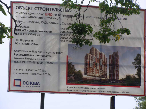 Строительство на земельном участке с кадастровым номером 77:09:0003012:121 ведет ООО «Специализированный застройщик Старокоптевский», созданное в марте 2019 года. Земля принадлежит компании на праве аренды. За последние три года застройщик не вел никакого жилищного строительства.