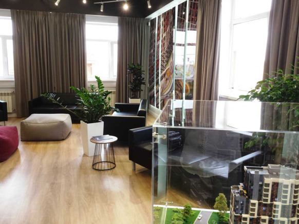 Офис продаж находится в некотором отдалении от строительной площади. Он расположен в бизнес-центре «Головинские пруды» на улице Михалковской.