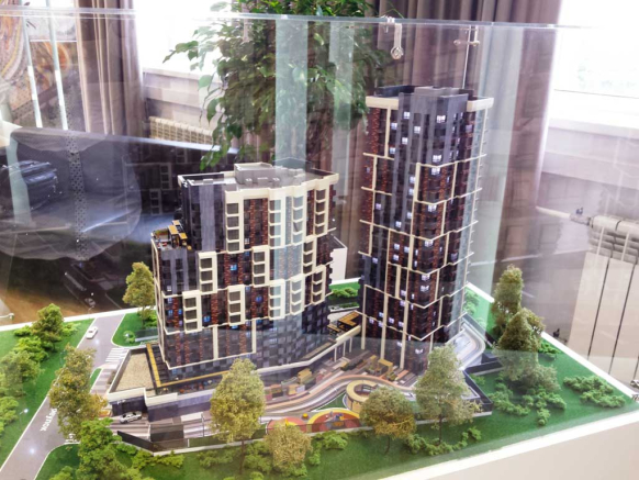 Имеется красочный макет новостройки и более чем скромная выставка отделочных материалов.
