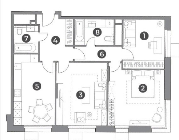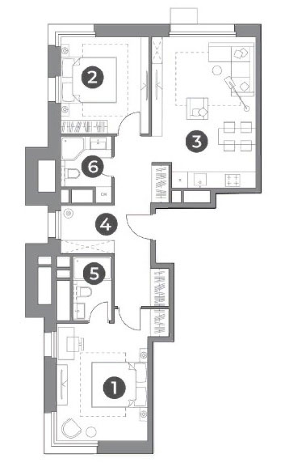 Трехкомнатные квартиры также запроектированы в двух форматах. Входная зона площадью от 5,21 до 12,8 кв.м. (с учетом коридора), два полноценных санузла, кухни площадью от 15,84 кв.м. до 31,27 кв.м. и спальни площадью от 11,47 до 18,08 кв.м. И опционально балкон площадью 2,8 кв.м., гардеробная площадью 2,18 кв.м. и терраса площадью 11,14 кв.м.