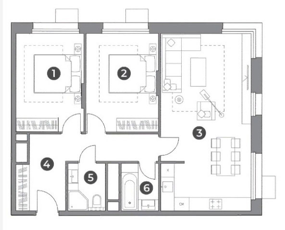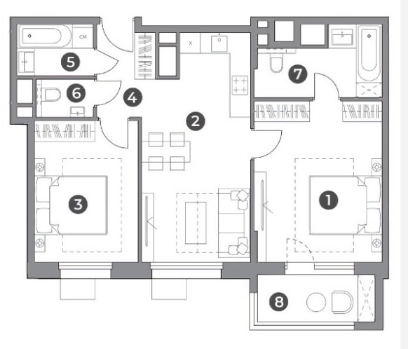 Двухкомнатные квартиры дают собственнику больше жизненного пространства. Встречаются как классические, так и европланировки. Что же мы имеем? Входная зона площадью от 2,89 до 7,0 кв.м., совмещенные или раздельные санузлы с площадью помещений от 3,09 до 4,81 кв.м., кухни (или кухни-гостиные в евровариантах) площадью от 15,98 до 23,87 кв.м. и спальни площадью от 11,67 до 18,48 кв.м. И еще могут быть балкон площадью 2,8 кв.м. и терраса площадью 9,16 кв.м. Некоторые помещения оборудованы двумя или даже тремя окнами, в том числе угловыми.