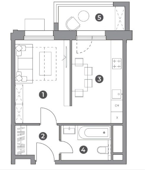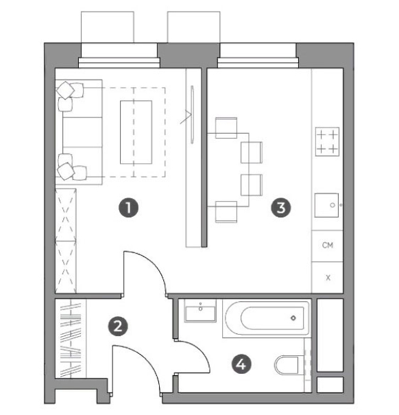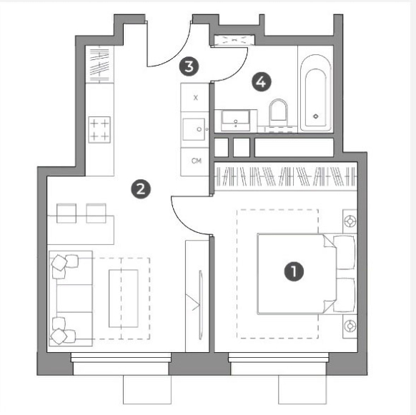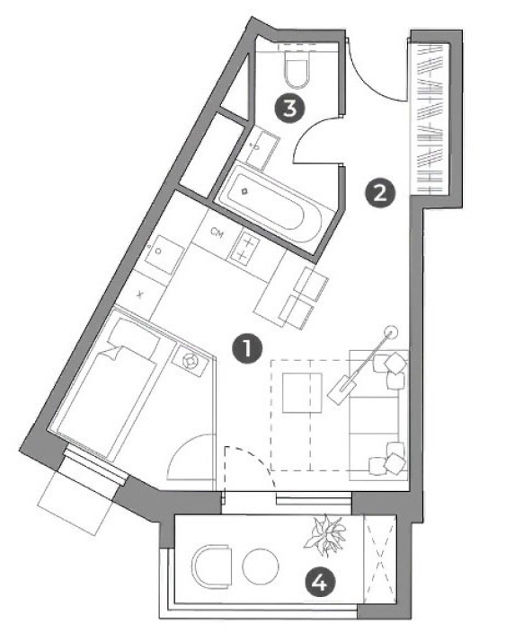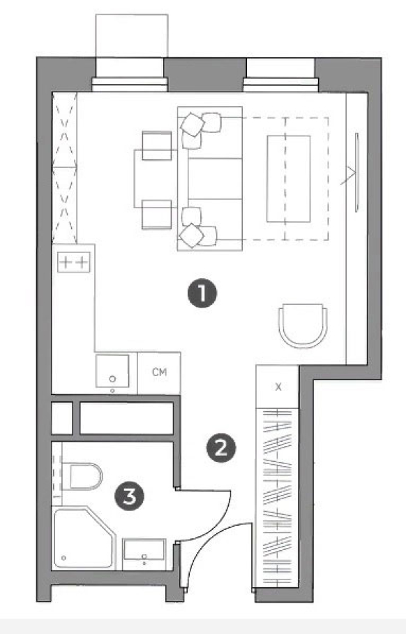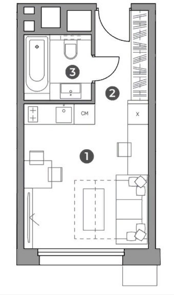 Квартиры - студии представляют собой базовый формат жилого помещения без каких-либо изысков. Входная зона площадью от 3,99 до 4,42 кв.м., совмещенный санузел площадью от 3,06 до 4,38 кв.м. и многофункциональное помещение площадью от 15,12 до 19,52 кв.м. Иногда встречается балкон площадью 2,8 кв.м. В некоторых вариантах планировок запроектировано по 2 окна, что позволяет более разнообразно зонировать миниатюрную квартиру.