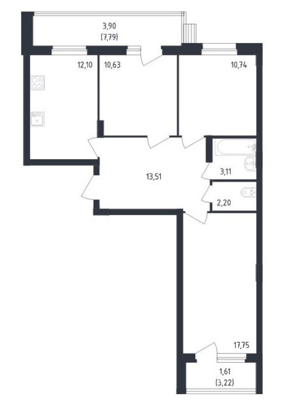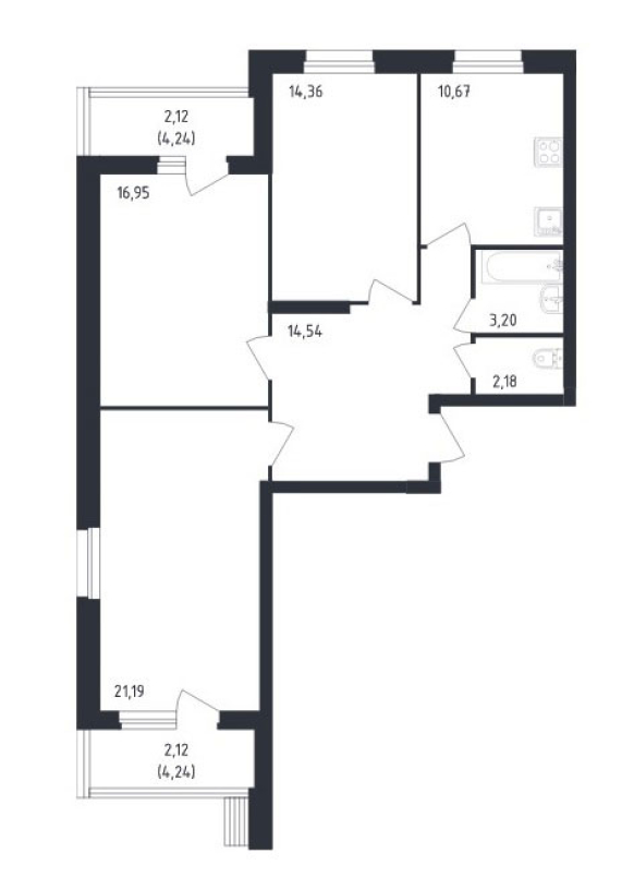Трехкомнатные квартиры предоставляют собственнику просторные входные группы площадью от 13,45 до 14,54 кв.м., раздельный санузел с площадью помещений от 1,66 до 3,2 кв.м., кухню площадью от 10,67 до 12,1 кв.м., три спальни площадью от 10,63 до 21,19 кв.м. Бонусом идут две лоджии или два балкона площадью от 3,22 до 7,79 кв.м. Чистая классика.