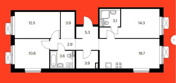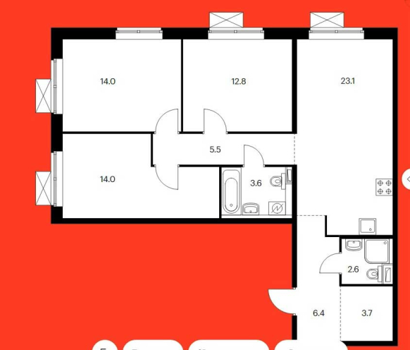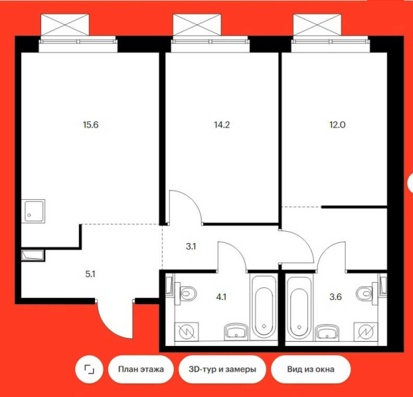 Трехкомнатные квартиры располагают входной зоной площадью от 2,4 до 6,4 кв.м., внутренними коридорами площадью от 2,1 до 5,5 кв.м. Два санузла площадью от 3,1 до 3,6 кв.м., кухни площадью от 18,7 до 23,1 кв.м. и спальни площадью от 10,8 до 18,7 кв.м. Некоторые спальни имеют собственный санузел. Встречаются гардеробные площадью 3,9 кв.м., иногда по две в одной квартире. Попадаются и квартиры с постирочными комнатами площадью 2,0 кв.м.