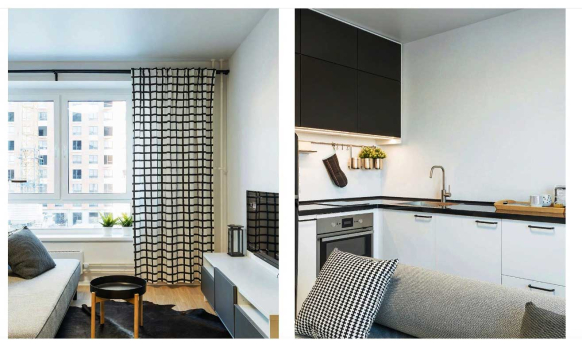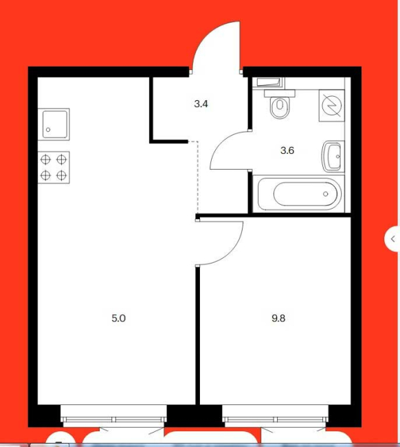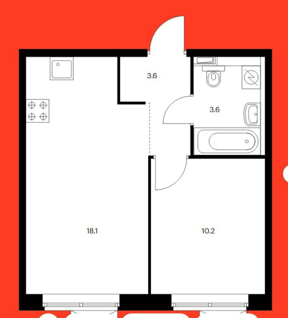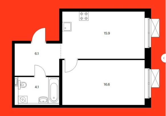 Однокомнатные квартиры располагают входной зоной площадью от 3,4 до 6,1 кв.м., совмещенным санузлом площадью от 3,6 до 4,1 кв.м., кухней площадью от 15,9 до 18,1 кв.м. и спальней площадью от 9,8 до 16,6 кв.м.