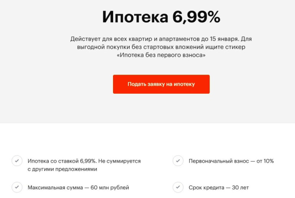 До 15 января действуют специальные ценовые предложения на квартиры: без первого взноса, без процентов по ипотеке до заселения, по специальной цене (ищем красные стикеры), семейная ипотека до 30 лет по ставке 4,6%.