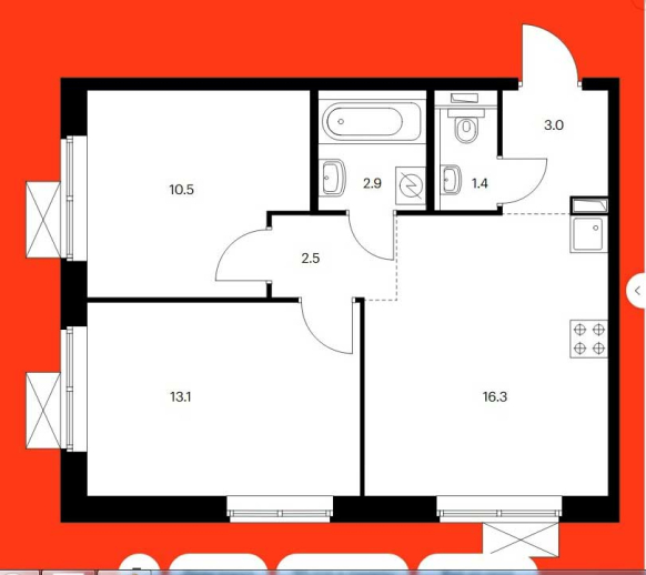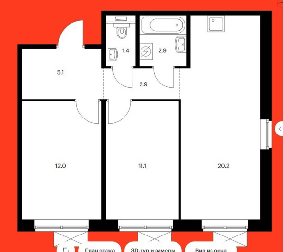 В двухкомнатных квартирах находим входную зону площадью от 3,4 до 5,1 кв.м., дополненную в ряде случаев внутренним коридором площадью от 2,5 до 3,1 кв.м. Санузел раздельный с площадью помещений от 1,4 до 3,6 кв.м. Кухня площадью от 5,0 до 20,2 кв.м., спальни площадью 9,8 до 14,2 кв.м. В некоторых помещениях может быть два окна. Встречаются планировки в формате евро.