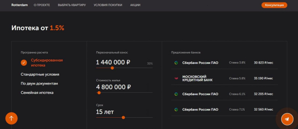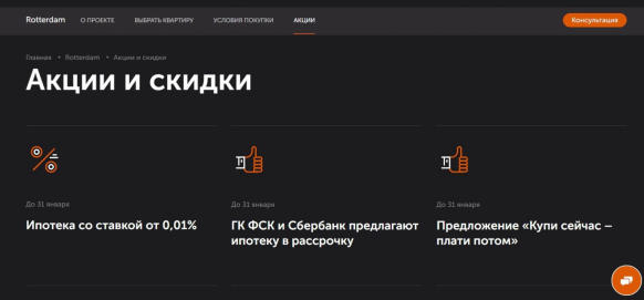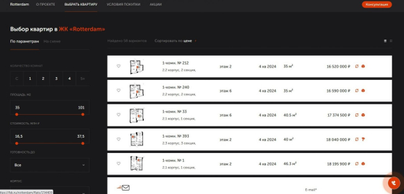 В сайт встроен удобный механизм выбора квартир с описанием планировок и указанием актуальных цен. Отсюда можно забронировать квартиру.