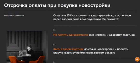Условия для третьего варианта такие: первый платеж 30 %, второй за 4 месяца до ввода здания в эксплуатацию. Но есть один нюанс - на оставшуюся сумму будет начислено 8% годовых.