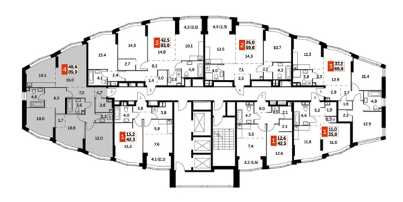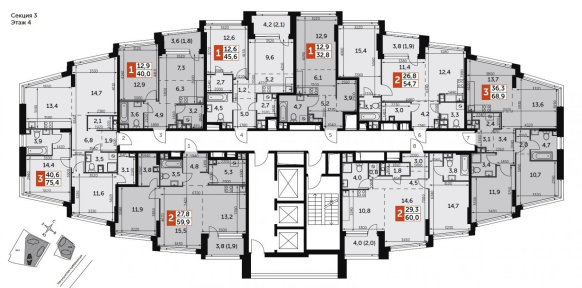 Четырехкомнатные квартиры евроформата располагают входной зоной от 8,9 до 13,0 кв.м. (с учетом внутренних коридоров), двумя полноценными санузлами площадью от 3,5 до 4,6 кв.м., кухней -гостиной площадью от 16,1 до 29,3 кв.м. Три спальни площадью от 10,0 до 15,0 кв.м., одна из них - мастер. А также гардеробные площадью от 2,6 до 2,8 кв.м. и постирочные площадью от 1,6 до 2,2 кв.м. Окна расположены на две или три стороны.