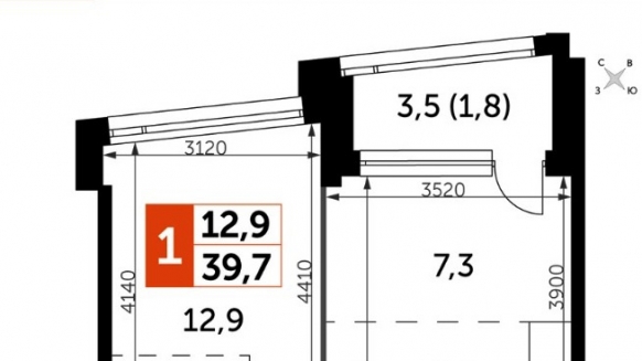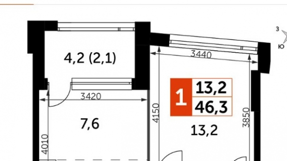 Однокомнатная квартира может проектироваться в двух форматах - евро и классическом. Входная зона площадью от 4,8 до 5,7 кв.м., совмещенный санузел площадью от 3,6 до 4,7 кв.м., кухня площадью от 13,6 до 19,0 кв.м., спальня площадью от 12,9 до 13,2 кв.м. Еще встречаются гардеробная площадью от 2,2 до 3,9 кв.м., лоджия площадью от 3,5 до 4,2 кв.м. и постирочная площадью 3,9 кв.м.