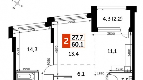 Двухкомнатные квартиры спланированы по европейским стандартам. Входная зона площадью от 4,6 до 8,9 кв.м., два санузла с площадью помещений от 3,1 до 3,7 кв.м., просторные кухни - гостиные суммарной площадью от 20,2 до 24,5 кв.м., мастер-спальня площадью от 14,3 до 15,6 кв.м. Кроме того, в наличии имеются балконы площадью от 3,5 до 4,3 кв.м. и гардеробные площадью от 2,3 до 3,8 кв.м. Расположение окон, как правило, одностороннее.
