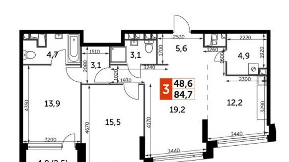 Трехкомнатные квартиры тоже европейской планировки. Входная зона площадью от 5,6 до 8,7 кв.м. (с учетом внутренних коридоров), два полноценных санузла с площадью помещений от 3,1 до 4,7 кв.м., кухня-гостиная площадью от 23,6 до 29,4 кв.м. Также имеются две спальни площадью от 10,8 до 15,5 кв.м., причем одна из них в формате «мастер», с собственным санузлом. Встречаются постирочные площадью от 1,5 до 4,5 кв.м., гардеробные площадью от 2,0 до 3,1 кв.м., лоджии площадью 4,9 кв.м. Квартиры могут быть односторонними и двухсторонними.