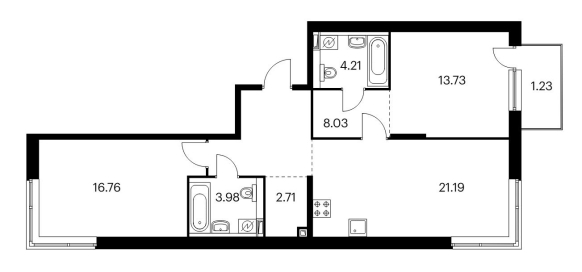 Двухкомнатные квартиры располагают входной зоной площадью от 3,37 до 5,0 кв.м., двумя санузлами с площадью помещений от 1,62 до 4,21 кв.м., кухней площадью от 17,83 до 21,27 кв.м. и двумя спальнями площадью от 10,56 до м16, 76 кв.м. Встречаются гардеробные площадью 2,71 кв.м. и балконы площадью 2,46 кв.м. В некоторых помещениях может быть по два окна, в том числе угловых. Расположение комнат может быть угловым и на две стороны.