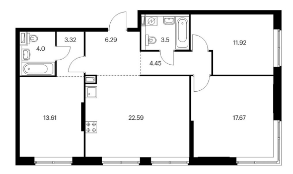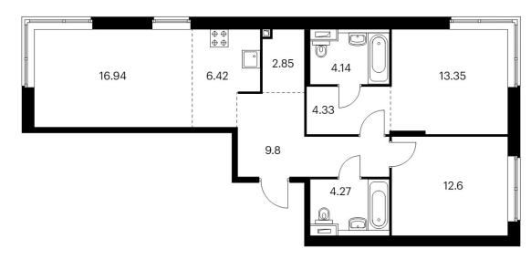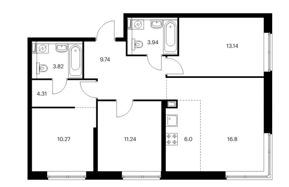 Четырехкомнатная квартира спроектирована в формате евро. Входная зона площадью 9,74 кв.м., два санузла с площадью помещений от 3,83 до 3,94 кв.м., кухня-гостиная площадью 22,8 кв.м. и три спальни площадью от 11,24 до 14,58. Одна из спален с внутренним санузлом. Расположение комнат угловое, оконные конструкции тоже встречаются в угловом исполнении.