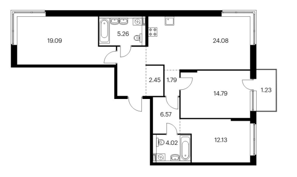 Трехкомнатная квартира (встречается как стнадарт, так и евро), предоставляет в распоряжение собственника входную зону площадью от 5,45 до 9,8 кв.м., два санузла с площадью помещений от 4,0 до 5,26 кв.м., кухню площадью от 22,59 до 24,08 кв.м. и три спальни с площадью помещений от 11,89 до 19,03 кв.м. Встречаются планировки с балконом и одной или двумя мастер-спальнями, с угловыми окнами и двумя окнами в одном помещении. Расположение комнат угловое и на две стороны.