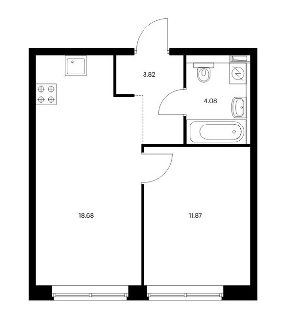 В однокомнатных квартирах находим входную зону площадью от 3,82 до 11,27 кв.м., совмещенный санузел площадью от 3,94 до 4,12 кв.м., кухню площадью от 13,8 до 18,68 и спальню площадью от 10,44 до 11,99 к.м. И в некоторых случаях небольшой балкон площадью 2,46 кв.м.