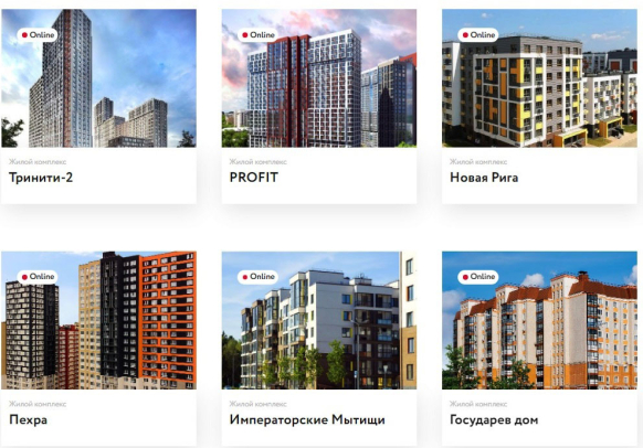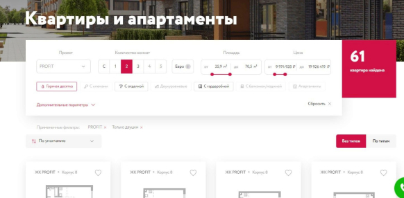 В сайт вставлен удобный механизм выбора квартир с возможностью поиска по параметрам: количество комнат, тип, площадь и цена. Отсюда же, с сайта, можно забронировать квартиру.