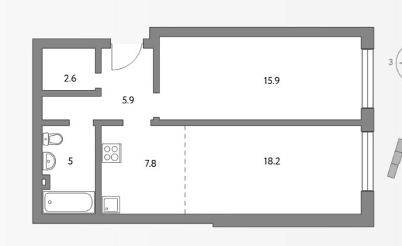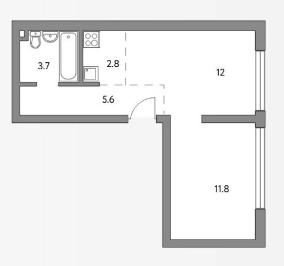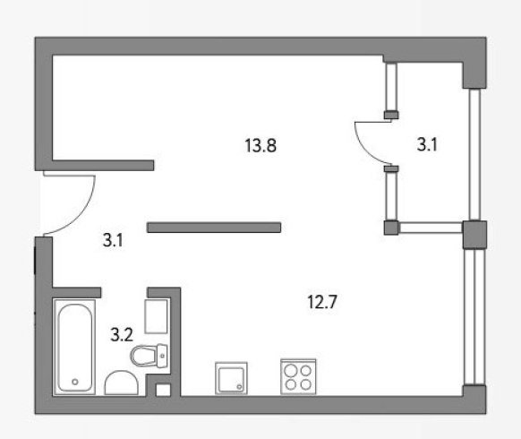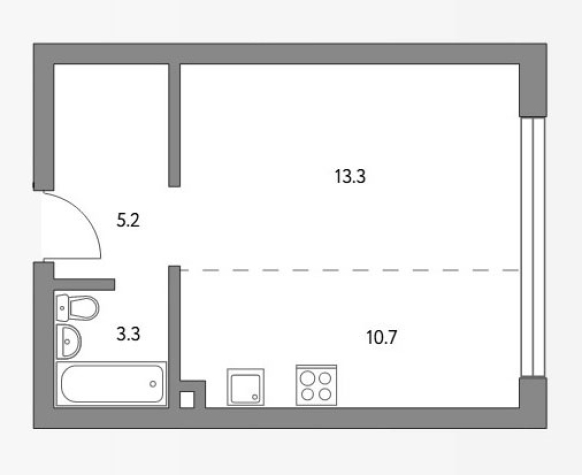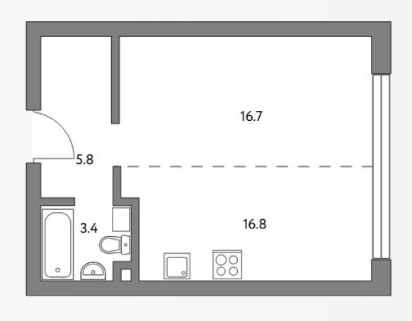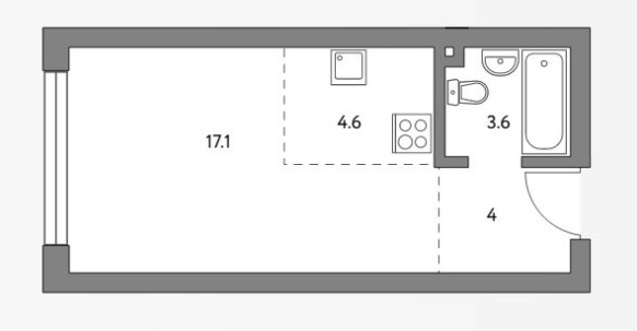 Квартиры-студии располагают входной зоной площадью от 4,0 до 5,8 кв.м., совмещенным санузлом площадью от 3,3 до 3,6 кв.м. и универсальным помещение площадью от 18,3 до 37,5 кв.м.