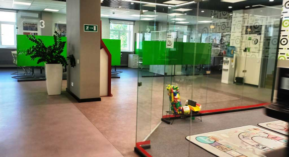 В распоряжении менеджеров девять рабочих комнат для переговоров, макет новостройки, шоу-рум (упрощенной конструкции) и строительный пейзаж, открывающийся прямо из окон второго этажа. Всего в здании старой постройки три этажа.