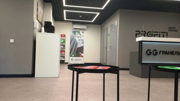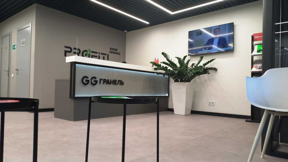 Офис продаж окна в окна смотрит на строительную площадку. В распоряжении посетителя уютная зона ресепшен с приветливым сотрудником и бесплатными напитками.