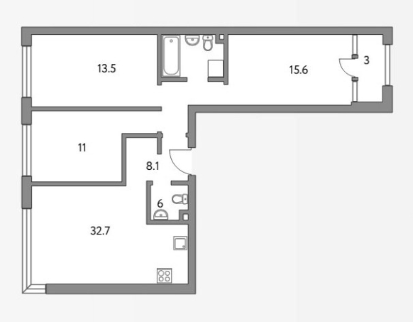 Формат трехкомнатных квартир - классика и евро. Входная зона площадью от 7,1 до 8,5 кв.м., два санузла площадью от 2.7 до 8,0 кв.м., автономная кухня площадью 32,7 кв.м., кухня-гостиная в квартирах евроформата площадью 21,4 кв.м. Встречаются лоджии площадью 3,0 кв.м. Встречаются квартиры как распашные, так и угловые с угловым остеклением.