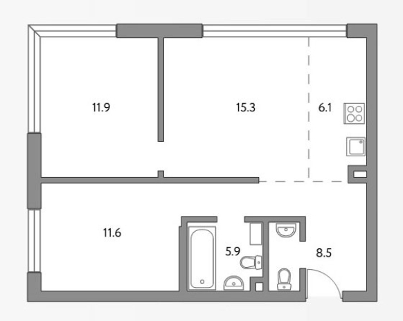 Планировка двухкомнатных квартир встречается как классическая так и евро. Входная зона площадью от 5,6 до 13,3 кв.м., один или два санузла с площадью помещений от 3,5 до 6,0 кв.м. Кухни площадью 14,1 кв.м. в классике и объединенное помещение в формате евро площадью от 14,8 до 26 кв.м. Спальни площадью от 11,8 до 18,6 кв.м., изредка лоджии площадью 3,1 кв.м., иногда гардеробная площадью около 2,5 кв.м. Из экзотики окно в ванной и комнаты с двумя окнами, одно из которых угловое.