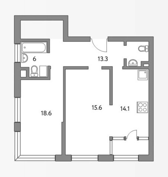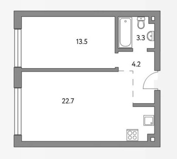 Однокомнатные квартиры запроектированы как в классических традициях, так и в стиле евро. Входная зона площадью от 3,1 до 4,2 кв.м., совмещенный санузел площадью от 3,3 до 3,6 кв.м., кухня площадью от 12,7 до 22,7 кв.м., спальня площадью от 13,5 до 13,8 кв.м. В евро планировках объединенное помещение достигает по площади 21,7 кв.м. В некоторых квартирах встречается лоджия площадью 3,1 кв.м.