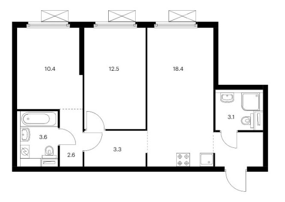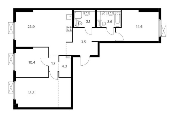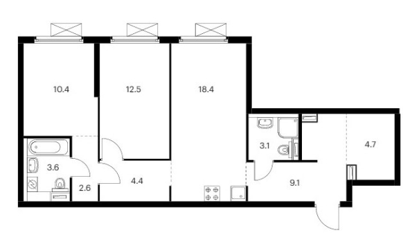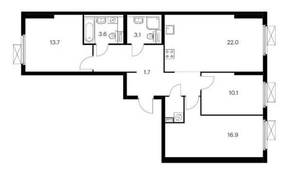 Трехкомнатная квартира оснащена входной зоной площадью от 1,7 до 2,6 кв.м., двумя санузлами с площадью помещений от 3,1 до 3,6 кв.м., кухней площадью от 22,0 до 23,9 кв.м. и тремя спальнями площадью от 10,1 до 16,9 кв.м. Встречаются гардеробные площадью 4,0 кв.м. и постирочные площадью 1,5 кв.м. Расположение комнат двухстороннее (распашное).