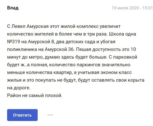 Минусом будет и некоторая перенаселенность района, ведь рядом уже заселенный комплекс «Левел Амурская», а через дорогу строится жилой комплекс «Реновация - Гольяново» на полторы тысячи квартир под реновацию.