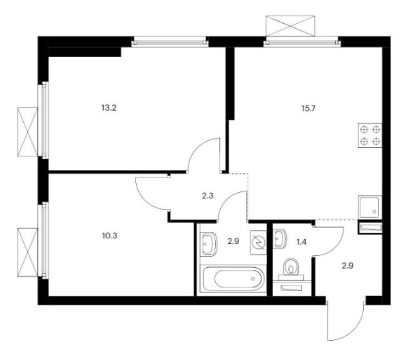 Двухкомнатные квартиры оснащены прихожей сложной формы суммарной площадью от 5,2 до 13,8 кв.м., два санузла с площадью помещений от 1,4 до 3,6 кв.м., кухней площадью от 15,4 до 18,4 кв.м., и двумя спальнями площадью от 10,3 до 13,2 кв.м. В некоторых вариантах планировок встречается мастер-спальня с собственным санузлом. Расположение комнат угловое или одностороннее. В некоторых комнатах может быть два окна.