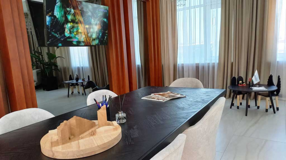 Офис находится через дорогу от строительной площадки. У посетителя есть возможность в сопровождении менеджера выйти на террасу, откуда стройка видна, как на ладони, и наблюдать за работой строителей в реальном времени.