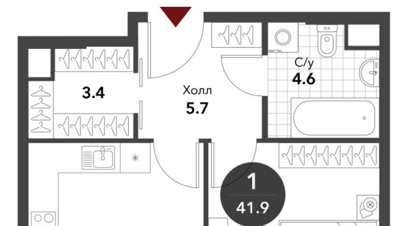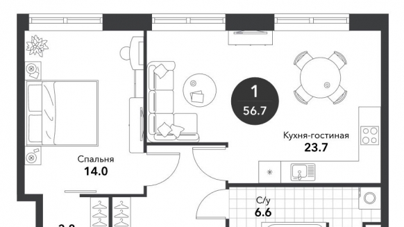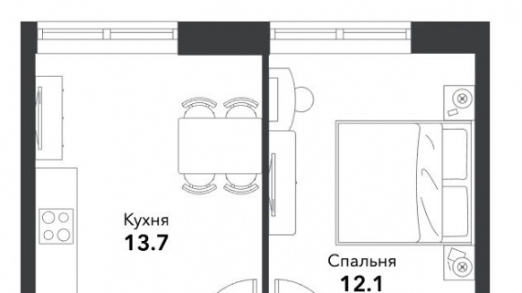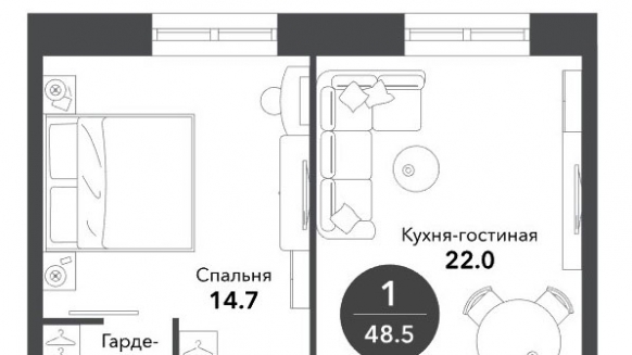 Однокомнатные квартиры располагают входной зоной площадью от 6,9 до 8,6 кв.м., совмещенным санузлом площадью от 4,6 до 6,6 кв.м., кухней площадью от 13,7 до 23,7 кв.м. и спальней площадью от 12,1 до 14,0 кв.м. Встречается гардеробная площадью от 3,4 до 3,8 кв.м.