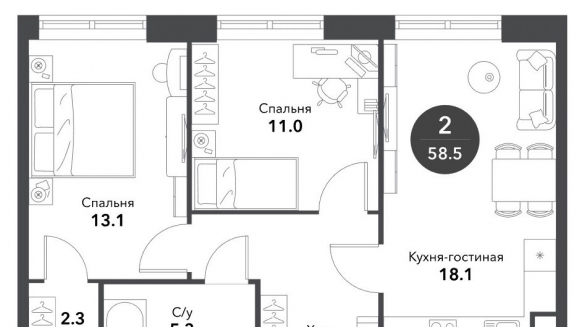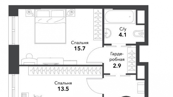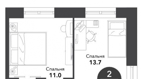 Двухкомнатные апартаменты располагают входной зоной площадью от 10,7 до 11,5 кв.м. (с учетом внутреннего коридора), двумя санузлами с площадью помещений от 3,1 до 6,0 кв.м., кухней площадью от 15,5 до 17,9 кв.м. и двумя спальнями площадью от 11,0 до 17,0 кв.м. Встречаются гардеробные площадью от 2,0 до 2,9 кв.м. В некоторых вариантах планировки встречаются санузлы с окном.