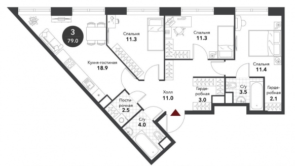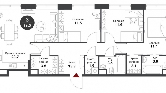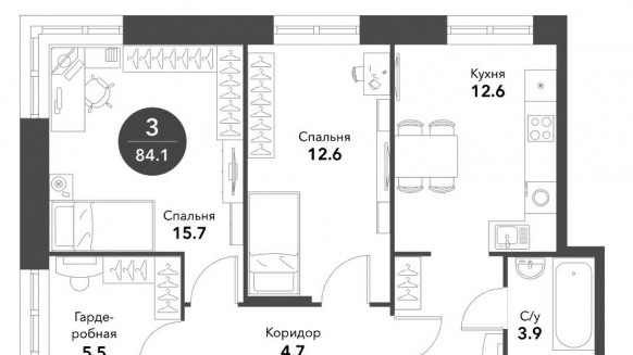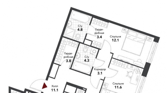 В трехкомнатных апартаментах запроектированы входная зона площадью 6,9 плюс внутренний коридор площадью 4,7 кв.м., два санузла площадью 3,9 кв.м. каждый, кухня площадью 12,6 кв.м. и три спальни площадью от 12,6 до 15,7 кв.м. А так же две гардеробные площадью 2,6 и 5,5 кв.м.