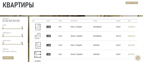 В сайт встроен механизм выбора квартир по параметрам. Выбирается комнатность, корпус, стоимость, метраж, отделка. Все хорошо, но будьте готовы, что всякий раз после очередного серфинга вы будете попадать на начальную страницу поискового механизма.