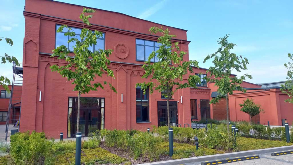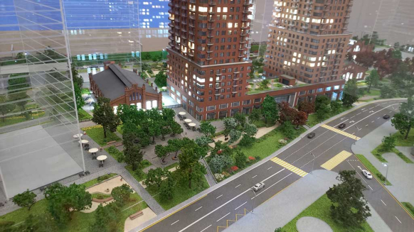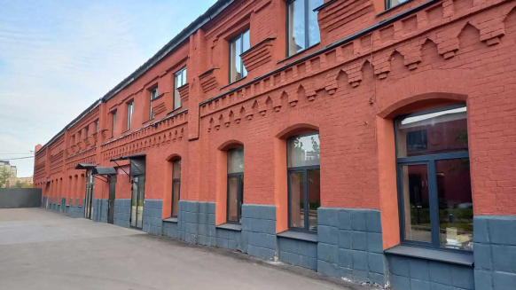 Навесные вентилируемые фасады башен отделают клинкерной плиткой, имитирующей цвет красного кирпича. Выбор цвета не случаен – ведь все строительство ведется на территории бывших вагоноремонтных мастерских Московско-Александровской железной дороги, построенных в начале 19 века из красного кирпича. Четыре старинных здания будут отреставрированы и войдут в состав комплекса в качестве памятников краснокирпичной промышленной архитектуры. В ходе реставрации дизайнеры планируют сохранить оригинальное напольное покрытие мастерских - гексагональная чугунная плитка.