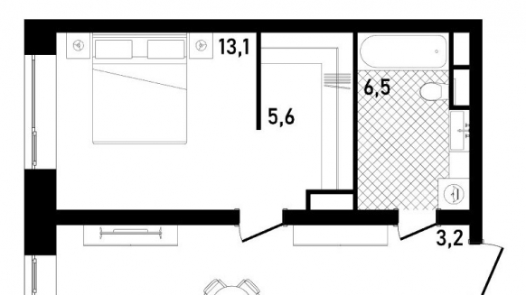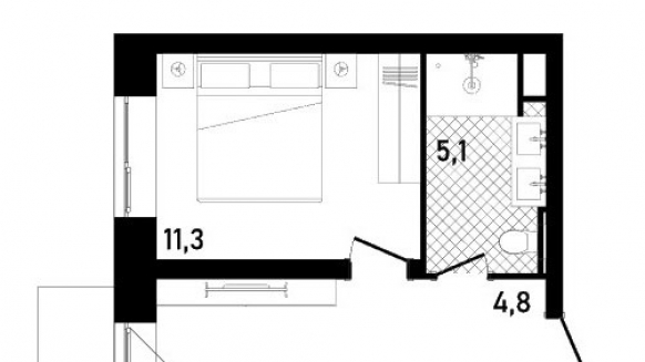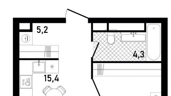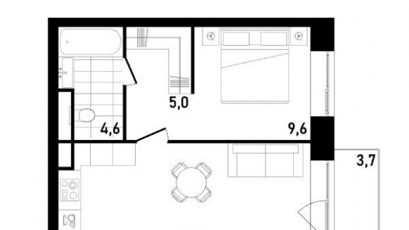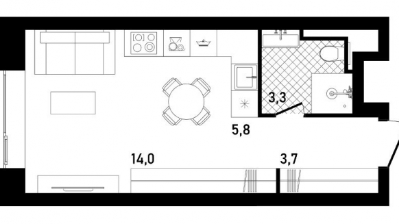 В студиях запроектирована входная зона площадью от 3,7 до 6,2 кв.м., совмещенный санузел площадью от 3,3 до 3,8 кв.м. и универсальное помещение (кухня-гостиная-спальня) площадью от 19,8 до 21,5 кв.м. Оригинальным планировочным решением является укороченная внутренняя перегородка, отделяющая собственно кухонную зону от зоны отдыха.