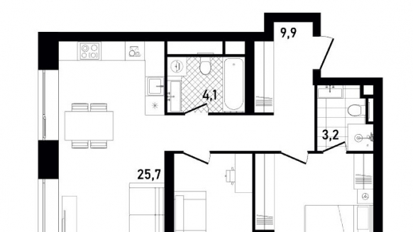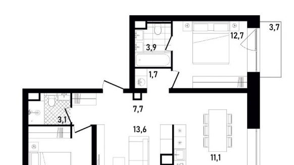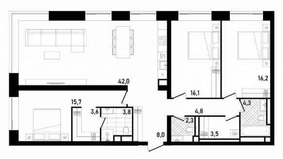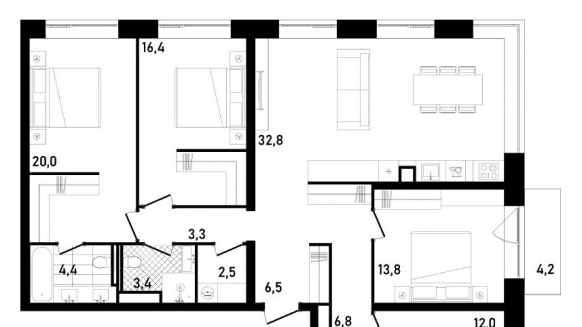 Трехкомнатные квартиры – это входная зона площадью от 4,9 до 8,0 кв.м., два или три санузла с площадью помещений от 1,7 до 3,8 кв.м., кухня-гостиная площадью от 24,7 до 42,0 кв.м., две (в евро-варианте) и три спальни площадью от 11,2 до 19,3 кв.м. Встречаются квартиры с двумя балконами площадью от 2,8 до 4,2 кв.м., с постирочными площадью 3,5 кв.м. В квартирах запроектированы одна или две мастер-спальни, есть помещения с двумя или тремя окнами, в том числе угловыми. Расположение комнат угловое.