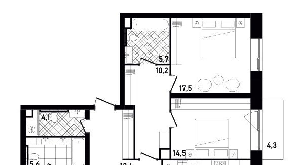 Двухкомнатные квартиры располагают входной зоной площадью от 4,2 до 7,7 кв.м., двумя санузлами с площадью помещений от 3,2 до 5,4 кв.м., кухней площадью от 16,0 до 25,7 кв.м. и двумя спальнями площадью от 14,6 до 18,9 кв.м. и балконами площадью от 2,8 до 3,7 кв.м. Есть варианты планировки с мастер-спальней. В некоторых спальнях установлена укороченная внутренняя перегородка, создающая пространство для гардеробной. Расположение комнат одностороннее и угловое, имеет место угловое остекление. В некоторых кухнях может быть два окна.