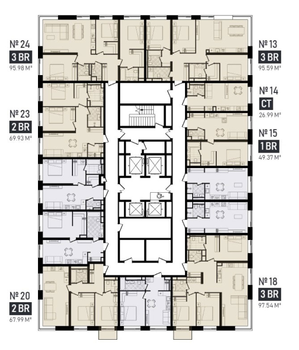 Башни односекционные, в каждой секции на одном этаже запроектировано от 7 до 12 квартир. В секциях установят по 4 лифта грузоподъемностью не менее 1000 кг, причем для удобства жителей пространство этажа будет разделено на две части. На этажах с 3 по 8 в каждой башне выделено по два помещения для хранения колясок и велосипедов.