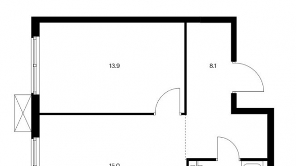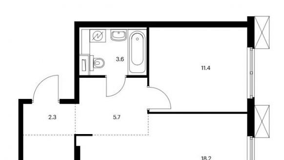 В однокомнатных квартирах находим входную зону площадью от 4,6 до 8,1 кв.м., совмещенный санузел площадью 3,6 кв.м., кухню площадью от 14,8 до 18,2 кв.м. и спальню площадью от 9,5 до 13,9 кв.м. Расположение комнат одностороннее и угловое, есть помещения с двумя окнами.