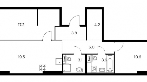 Двухкомнатные квартиры оснащены входной зоной площадью от 3,0 до 14,0 кв.м. (с учетом внутренних коридоров), одним или двумя санузлами с площадью помещений от 1,4 до 3,6 кв.м. В евро-вариантах планировки встречаются кухни-гостиные площадью 15,9 кв.м., в классическом варианте площадь кухни от 15,3 до 19,5 кв.м. Также в наличии одна или две спальни площадью от 10,2 до 17,2 кв.м. Расположение комнат одностороннее, распашное и угловое, есть помещения с двумя окнами.