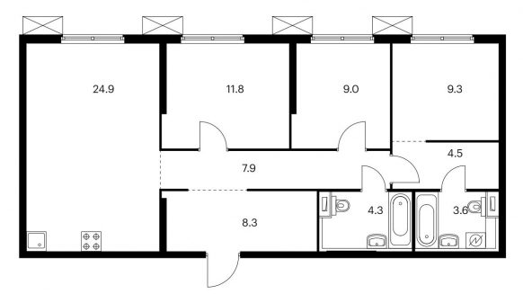 Трехкомнатные квартиры предоставляют собственнику входную зону площадью от 4,4 до 16,2 кв.м. (с учетом внутренних коридоров), два санузла с площадью помещений от 2,5 до 4,3 кв.м., кухонное помещение площадью 33,1 кв.м. в евро-варианте и 24,9 в классике. А также две или три спальни площадью 11,4 до 13,4 кв.м., причем в некоторых запроектирован автономный санузел. Расположение комнат одностороннее и угловое.