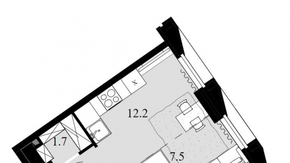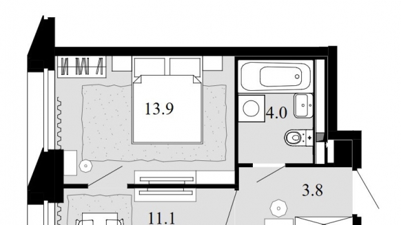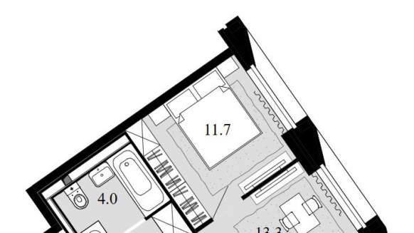 Однокомнатные квартиры спроектированы в классическом и евро формате. Входная зона площадью от 3,3 до 6,7 кв.м., совмещенный санузел площадью от 3,1 до 4,0 кв.м., кухня площадью от 11,1 до 13,3 кв.м. в «классике» и кухня-гостиная площадью 19,7 кв.м. В классическом комплекте спальня площадью от 11,7 до 13,9 кв.м. Встречается гардеробная площадью 1,7 кв.м.